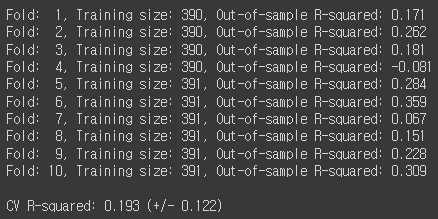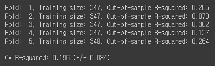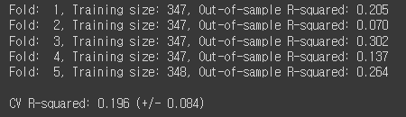 print('Fold: {:2d}, Training size: {}, Out-of-sample R-squared: {:.3f}'.format(i+1, len(y_train), score))