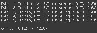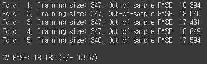 print('Fold: {:2d}, Training size: {}, Out-of-sample RMSE: {:.3f}'.format(k+1, len(y[train]), score))