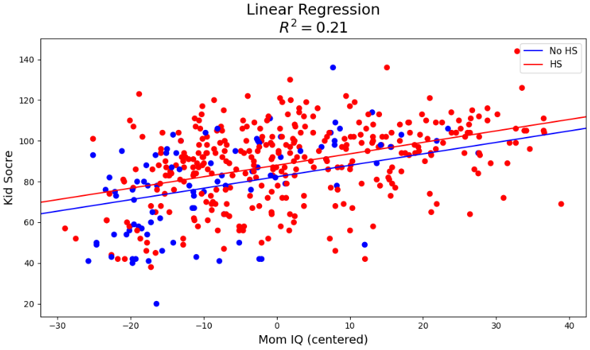 sm.graphics.abline_plot(intercept=b_hat['Intercept']+b_hat['mom_hs'], slope=b_hat['mom_iq_c'], color='red', label='HS', ax=ax)