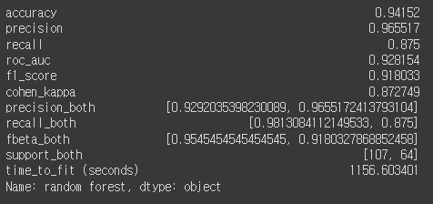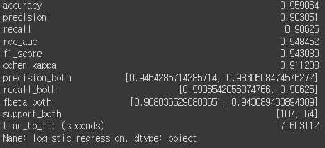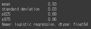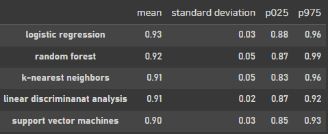 각 모델의 min, max, mean값을 확인하여 봤을때, 최고 성능을 보인건 Random Forest이지만 최저점도 그만큼 낮아 평균이 떨어지는것을 확인 할 수 있다. 편차도 적고 평균 성능도 가장 높게 나온 Logistic Regression이 오늘 사용한 데이터에는 가장 좋은 모델로 생각된다.
