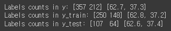 그리고 학습, 테스트 데이터셋으로 나누어주고 각각의 데이터셋이 같은 비율을 가지고 있는지도 확인해주었다.
