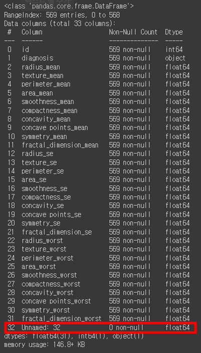양성/음성을 진단하는 M과 B를 각각 바꿔주고, 마지막에 데이터가 아예 들어가있지 않았던 컬럼을 삭제해준다.