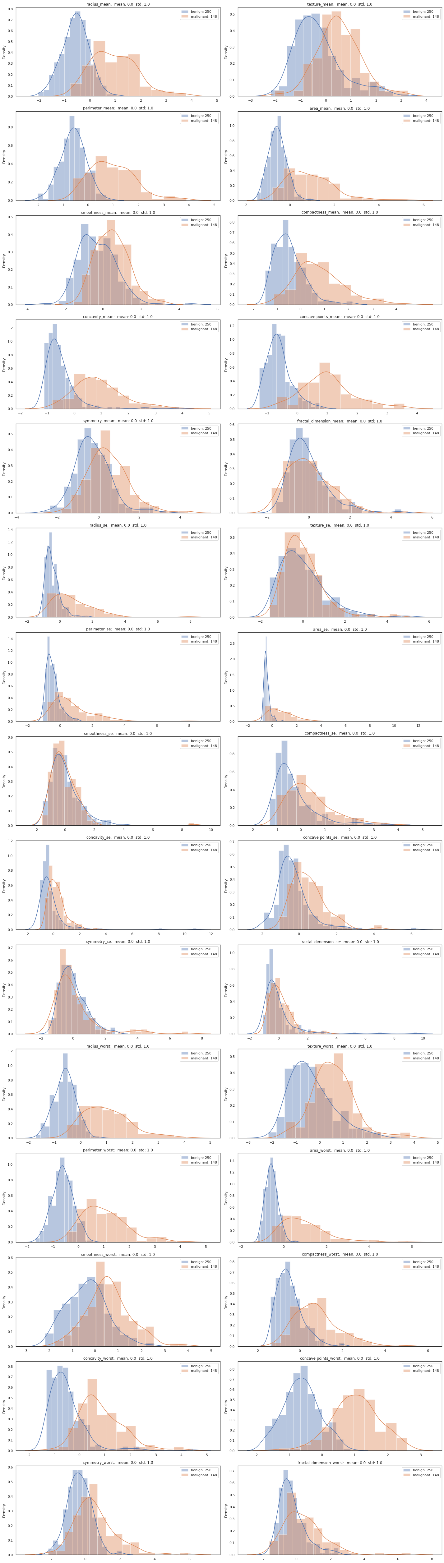 axs.flat[i].set_title('{}: mean: {} std: {}'.format(list(df.iloc[:, 2:].columns)[i], abs(feat.mean().round(2)), feat.std().round(2)))