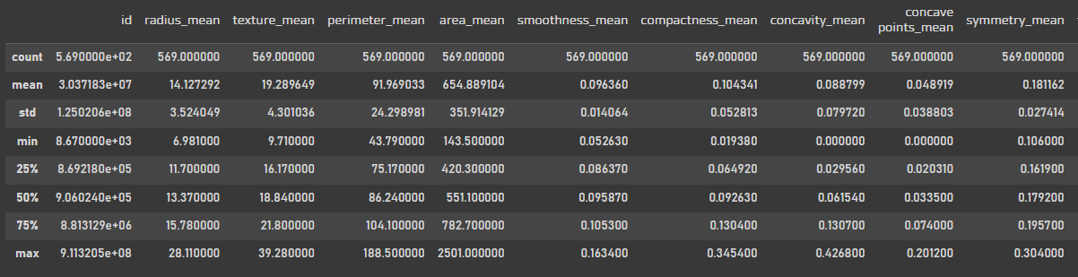 id는 환자를 나타내는 특성이기 때문에 무시하고, area_mean을 보면 min값과 max값의 차이가 많이나서 노이즈가 없는지 확인하는것이 좋을 것 같다. 여기서 평균값은 약 650정도로 min값에 좀 더 편향되어있을것이라고 예상해본다.
