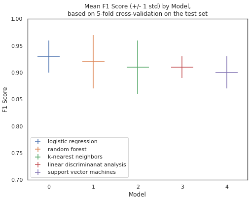 plt.title('Mean F1 Score (+/- 1 std) by Model,\nbased on 5-fold cross-validation on the test set')