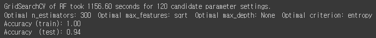 print('Optimal n_estimators: {} Optimal max_features: {} Optimal max_depth: {} Optimal criterion: {}'.format(gs_rf.best_params_['n_estimators'],