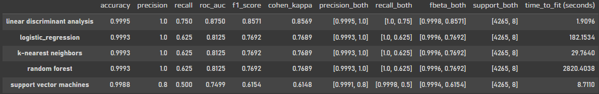 model_metrics = pd.concat([lr_metrics, knn_metrics, lda_metrics, svc_metrics, rf_metrics], axis=1).T