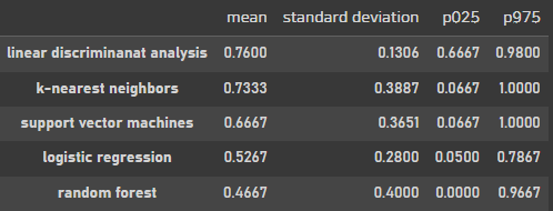 print('Optimal solver: {} Optimal shrinkage: {} Optimal n_components: {}'.format(gs_lda_resamp.best_params_['solver'],