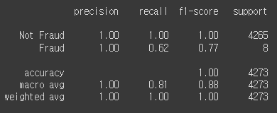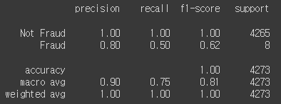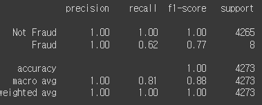 세부지표를 확인해보니 Undersampling 한 결과값에 비하면 현저히 떨어지는 모습을 모인다.