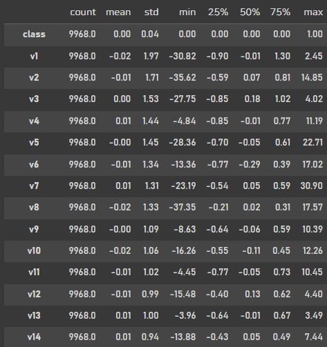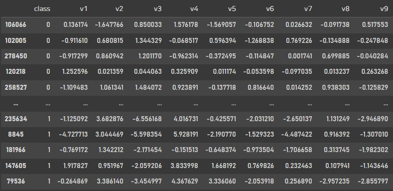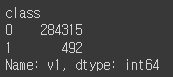 불러온 데이터는 class가 0이면 정상거래, 1이면 비정상거래로 판단하고 나머지는 신용카드 관련 정보이다.