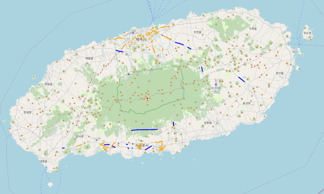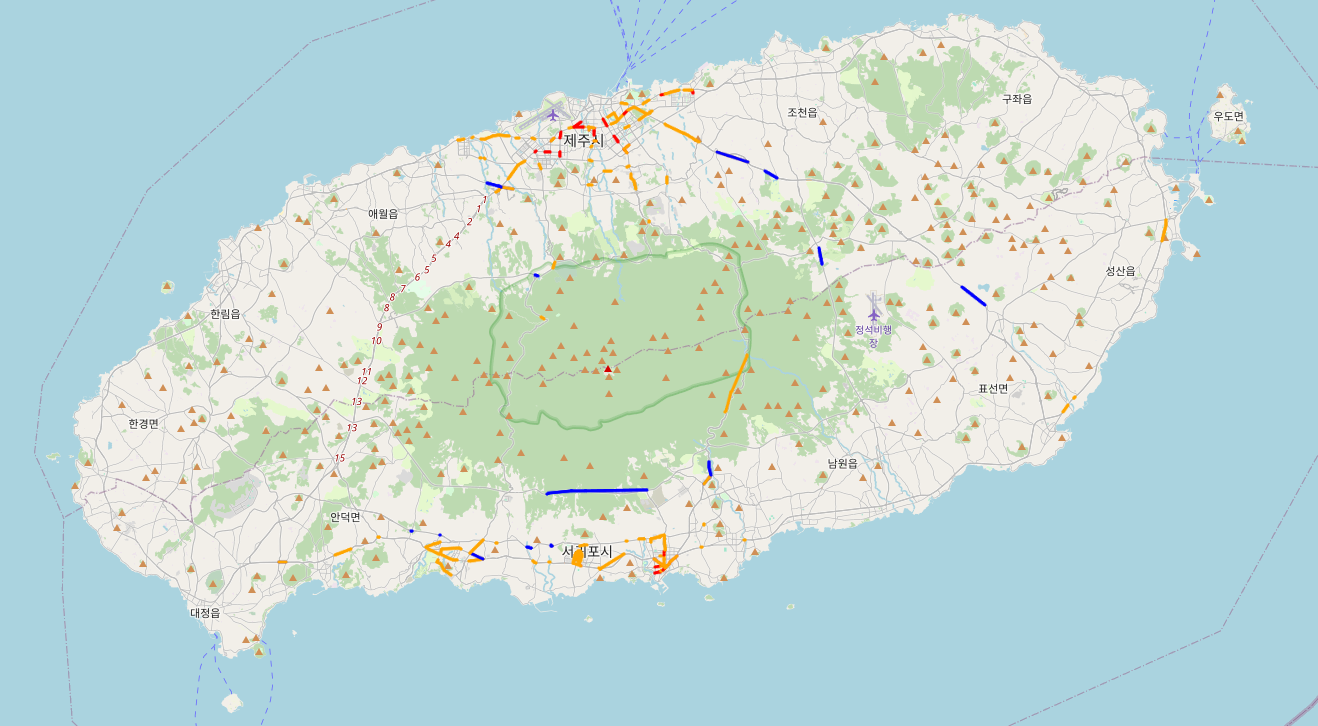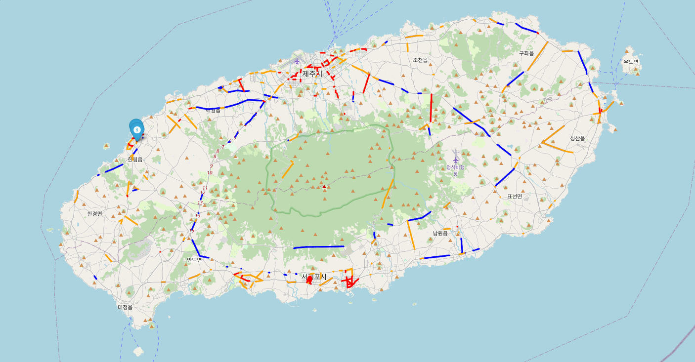 또한, 공항이 있는 제주시나, 관광지가 많은 서귀포시는 30km이하인 빨간 구간이 눈에 띄게 많이 보인다.