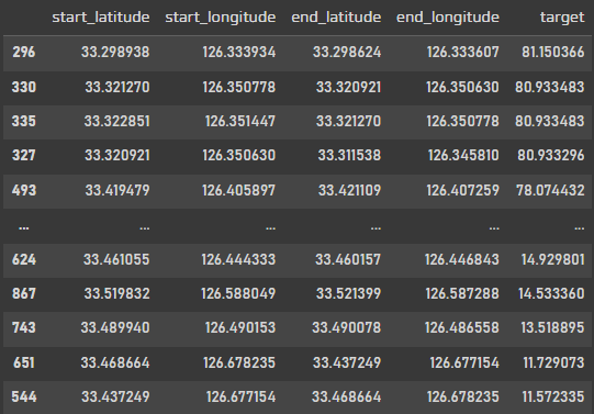 데이터를 살펴보니 위경도, 유턴제한 유무, 최고속도제한 등등이 데이터에 포함되어있고 target값으로는 평균속도가 들어있다.