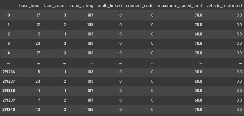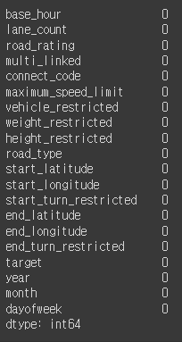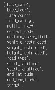 test_df = test_df.drop(['id', 'base_date', 'day_of_week', 'road_name', 'start_node_name', 'end_node_name'], axis=1)